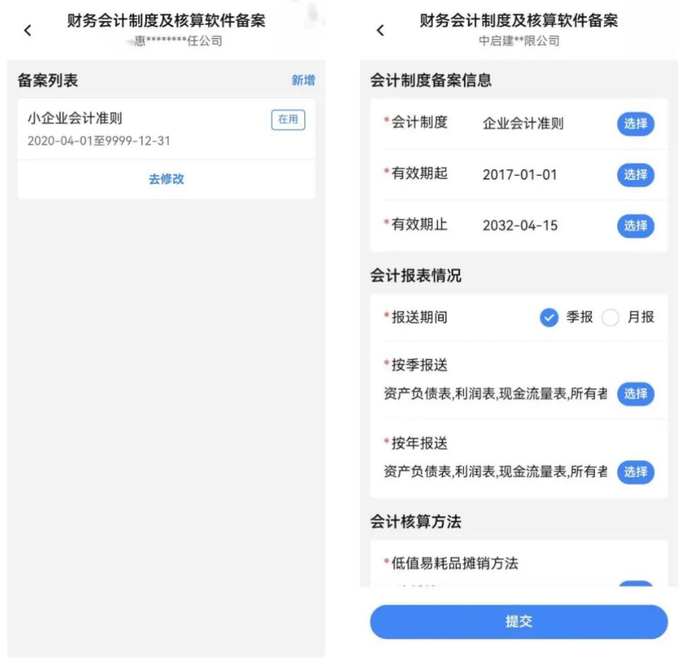 2.如您为非首次办理,系统将进入【备案列表】页面,展示已备案的信息。您可点击【去修改】对当前备案的会计制度信息、会计核算方法、会计核算软件信息进行修改,点击对应数据项的【选择】按钮可进入填写,点击【确定】完成填写。填写完成并确认无误后,点击【提交】,即可完成本次修改。