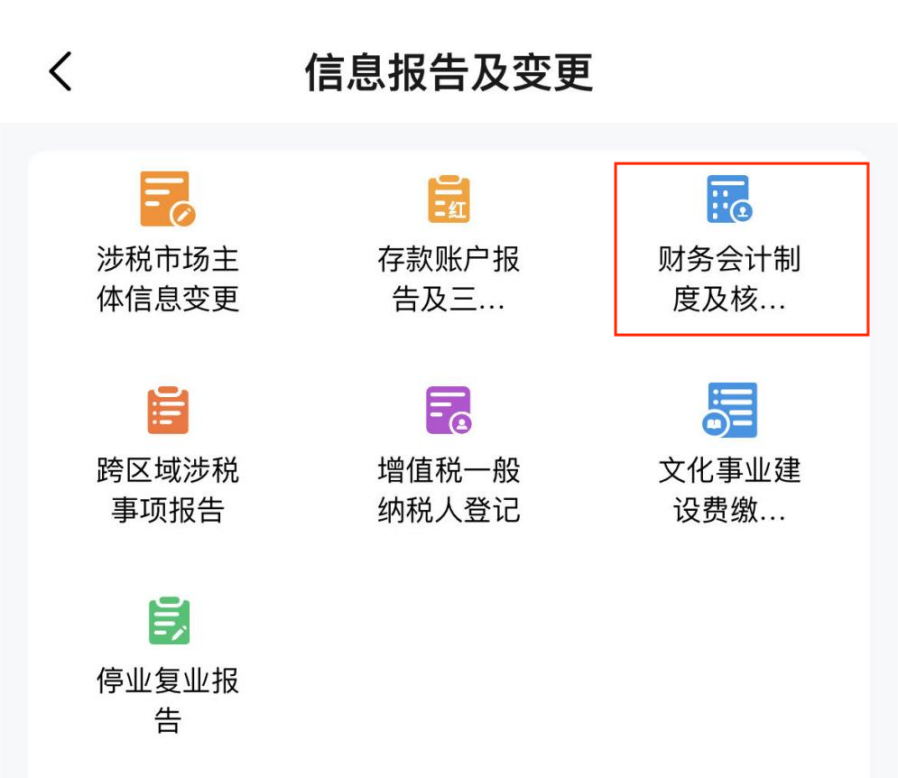 登录电子税务局App,点击【办&查】—【综合信息】—【信息报告及变更】—【财务会计制度及核算软件备案报告】功能菜单。