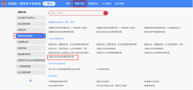 登录青岛市电子税务局(https://etax.qingdao.chinatax.gov.cn),点击“我要办税”——“税费申报及缴纳”——企业所得税申报类别下“关联业务往来年度报告申报”进入申报界面,按要求进行在线申报。