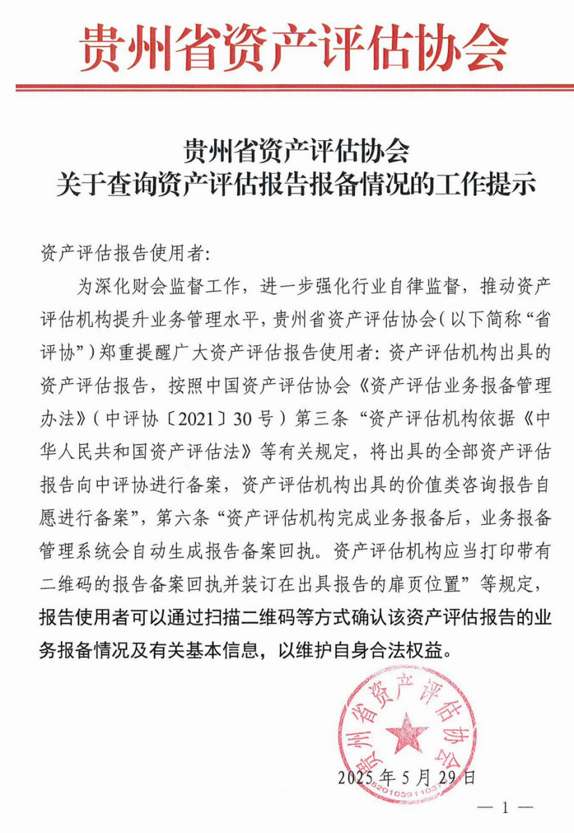 贵州省资产评估协会关于查询资产评估报告报备情况的工作提示
