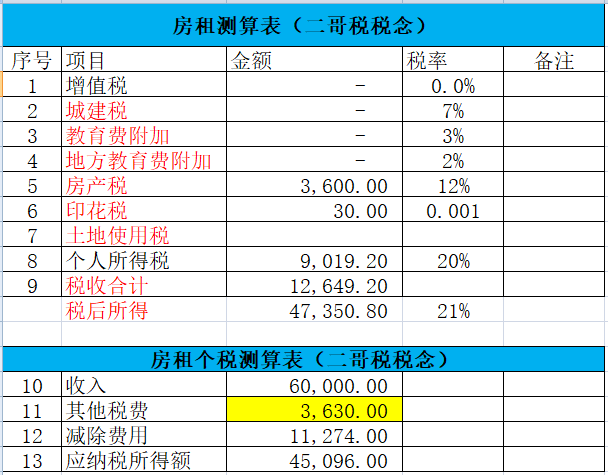 假如出租个人住房取得年租金60000,开具专票发票的话,那么实际应该缴纳的税分别是: