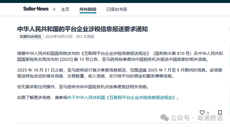10月13日,亚马逊发布了一则关于中国的平台企业涉税信息报送要求的通知。