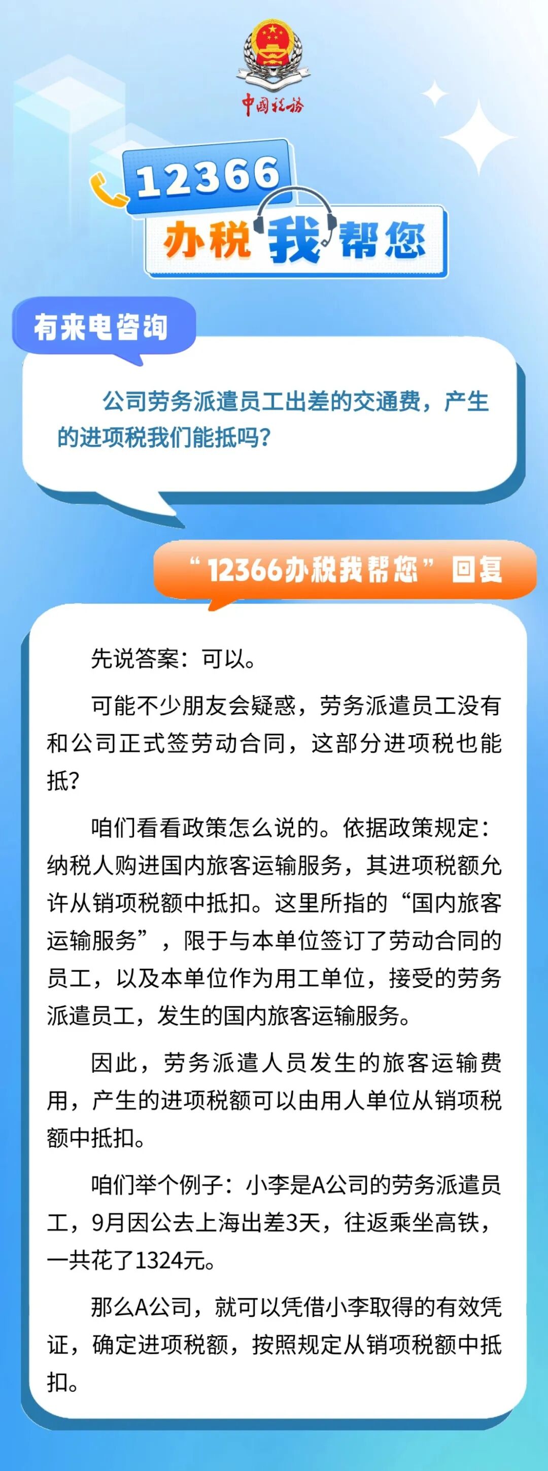 有来电咨询 :公司劳务派遣员工出差的交通费,产生的进项税我们能抵吗?一起来看看回复吧↓