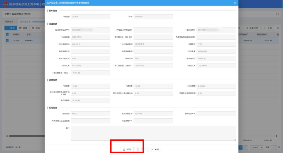 对选中的申报记录进行修改(比如将退运数量、金额等进行冲减),确认无误后点击保存。保存成功后,按照页面上方提示依次操作:确认汇总表 → 退税申报 → 申报结果查询,完成申报提交。