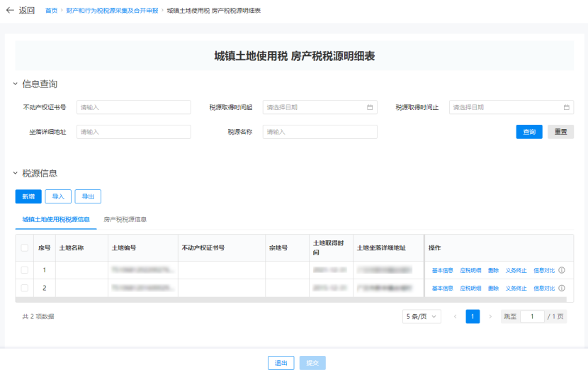 点击卡片上的【税源采集】,跳转到城镇土地使用税明细表界面。自动带出已有土地信息。