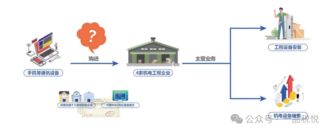 前期,大连市税务局第一稽查局通过税收大数据分析发现,4户主营业务为工程设备安装、机电设备销售等的本地企业,却从外地购入了大量与自身生产经营活动无关的手机等通讯设备,共取得了金额逾2800万元的增值税专用发票和增值税普通发票,且发票均来源于相同的几家企业,开票地址高度重合。