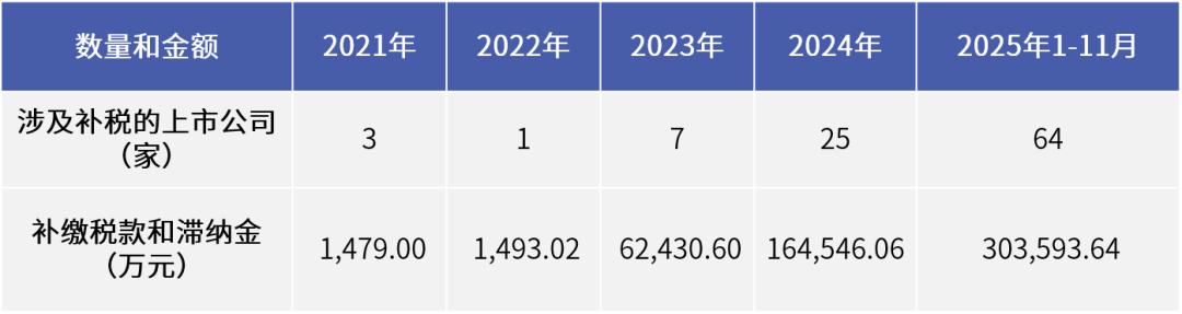 显然,2023年是重要的分水岭,2023年之前,上市公司补税是非常偶发的事项,2023年之后,上市公司补税事项已屡见不鲜且有大幅增加之势。在2025年尚未结束的情况下,已较2024年全年补税的上市公司数量增加156%,合计补缴税款金额增加185%。
