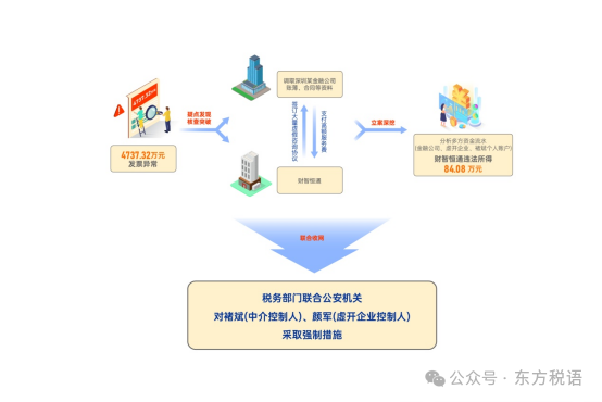 税务机关同步联合公安机关,锁定了上游虚开企业实际控制人颜军,一并予以查处。目前,财智恒通实际控制人褚斌、虚开企业实际控制人颜军已被公安机关采取强制措施,近期将移交检察机关审查起诉。