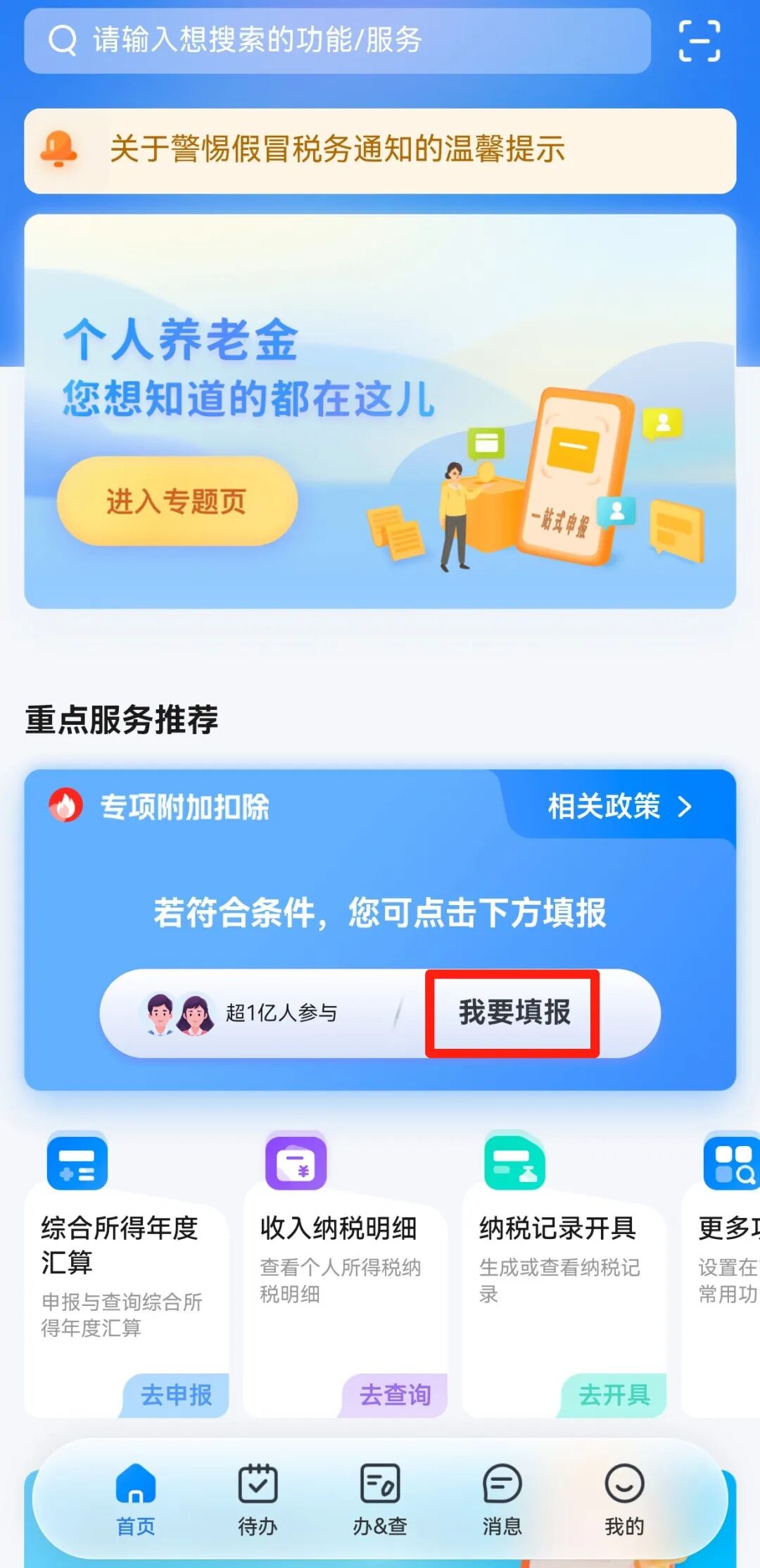 登录后即可跳转至“专项附加扣除”填报界面,点击需要补充填报的专项附加扣除项目,例如继续教育。