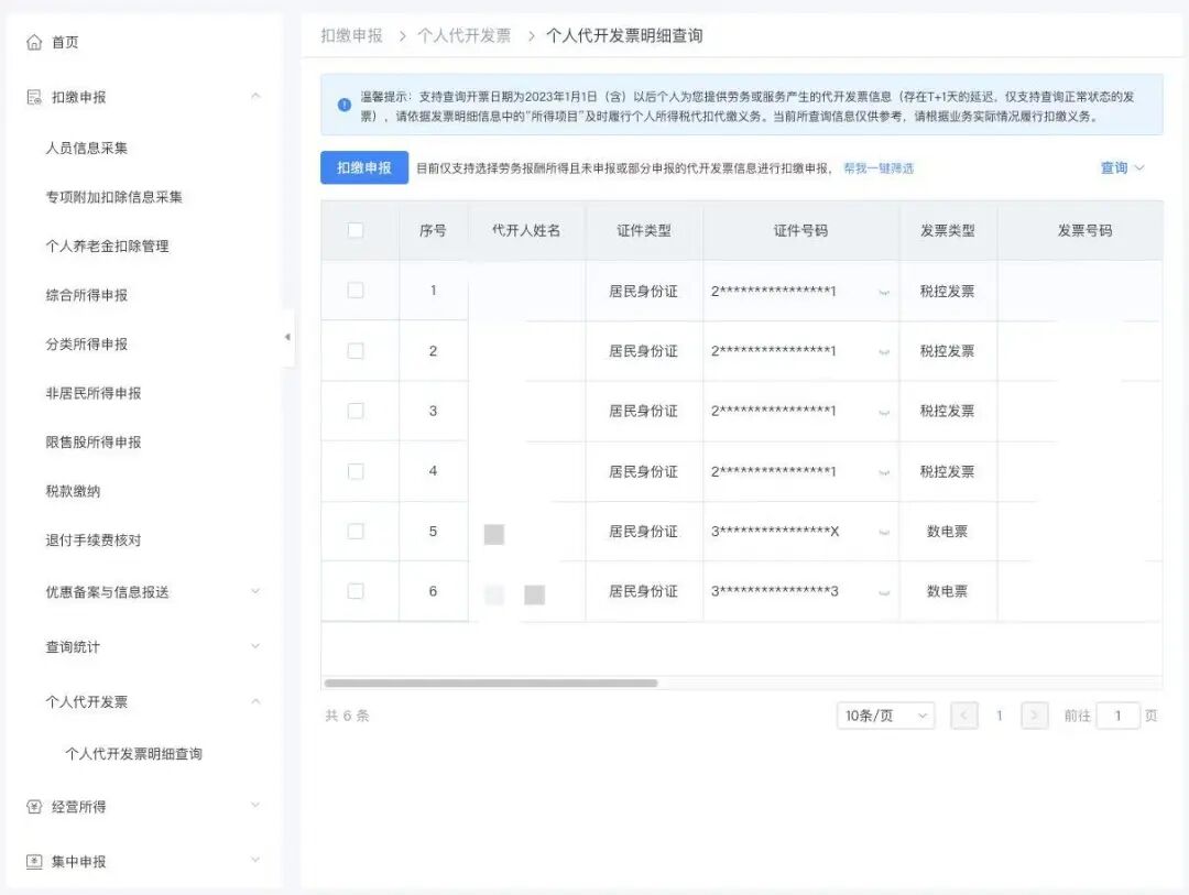 场景A:通过“个人代开发票明细查询”扣缴申报关联发票