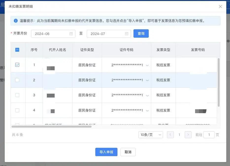 点击页面上方区域“查询”按钮左侧的“待扣缴发票明细”按钮,将出现弹窗,展示非汇总代开的所得项目为劳务报酬所得、申报状态为未申报或部分申报、发票状态为正常的发票数据。可单选或多选发票数据,点击“导入申报”按钮,系统根据发票信息自动生成相应的申报数据。