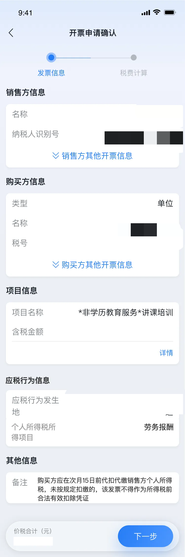 在“发票信息”页面,代开申请人确认企业预填的销售方信息、购买方信息、项目信息、应税地信息、备注信息是否正确,不支持代开申请人修改,如有异常,可联系企业修改。