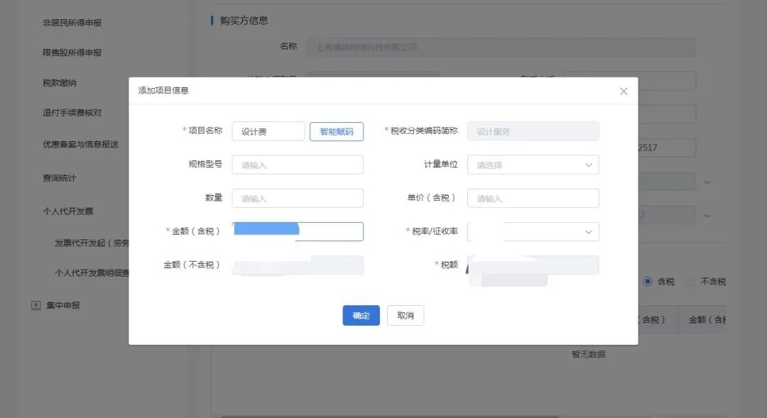 项目信息:点击“添加”按钮进入新增项目信息窗口。录入项目名称,点击“智能赋码”选择匹配的税收分类编码名称,依次录入规格型号、计量单位、数量、单价(含税)、金额(含税)、税率/征收率信息,然后点击“确定”完成添加。