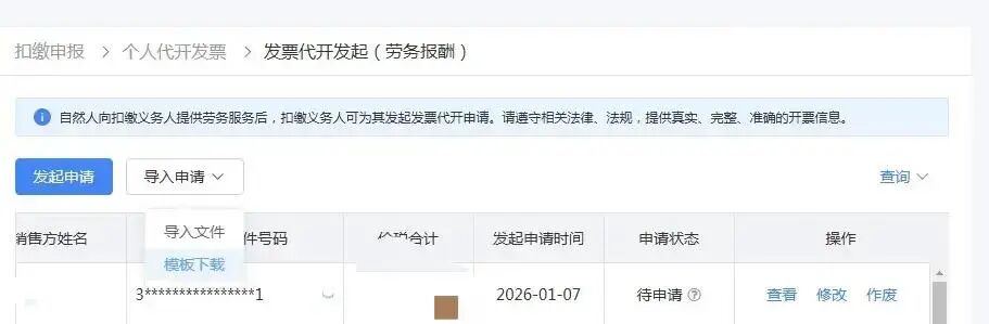 点击“发起申请”按钮开始为代开申请人发起劳务报酬发票代开信息。