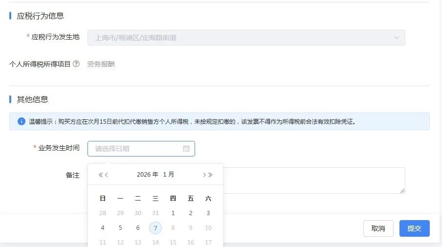 应税行为信息:应税行为发生地默认企业主管税务机关所在地,不支持修改;个人所得税项目默认为劳务报酬,不支持修改。