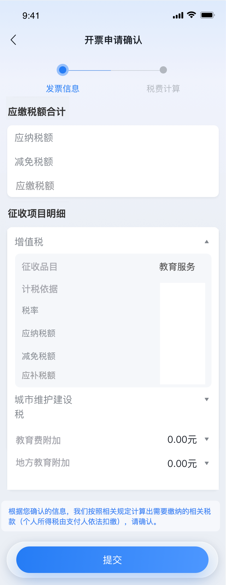 确认申请信息无误后,点击“下一步”进入税款计算页面,确认增值税、城市维护建设税、教育费附加、地方教育附加等各项征收项目应纳税额、减免税额、应缴税额等信息。