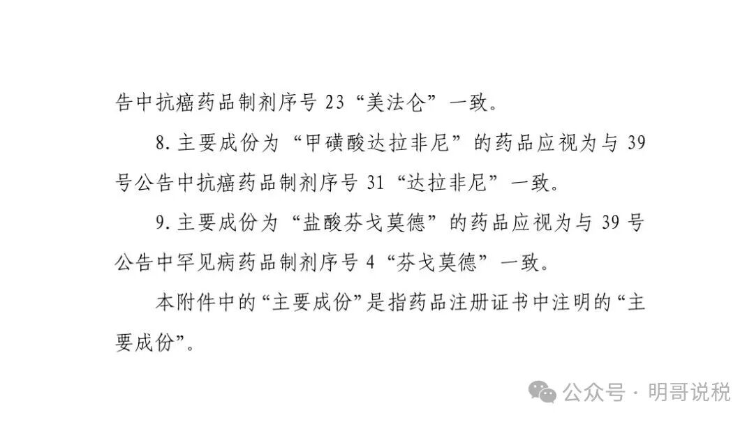 四、本公告附件3所列药品应视为与《财政部 海关总署 税务总局 国家药品监督管理局关于抗癌药品增值税政策的通知》(财税〔2018〕47号)、《财政部 海关总署 税务总局 药监局关于发布第二批适用增值税政策的抗癌药品和罕见病药品清单的公告》(财政部 海关总署 税务总局 药监局公告2020年第39号)所附清单中对应药品活性成分名称/活性成分通用名称一致,并按上述政策规定的实施日期及要求执行相关增值税政策。