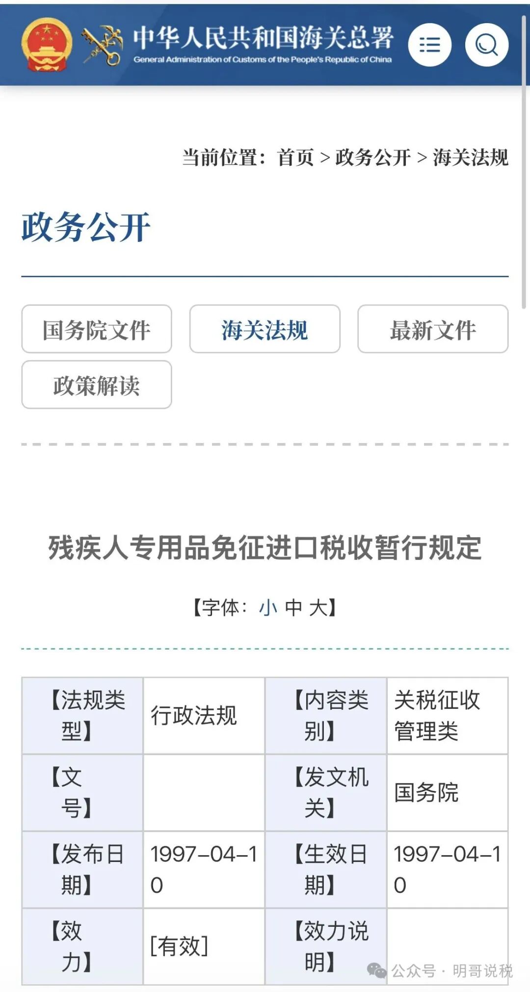 明哥说税按:其他在增值税法施行前已实施的,执行期限截止日期在2026年1月1日之后的进口环节增值税优惠政策及相关配套文件,不清楚有哪些,上网搜索到海关总署官网标注为有效的《残疾人专用品免征进口税收暂行规定》。根据《中华人民共和国增值税法》第二十四条规定,由残疾人的组织直接进口供残疾人专用的物品,残疾人个人提供的服务。下列文件是否与此相冲突?海关总署是根据什么上位法制定《残疾人专用品免征进口税收暂行规定》的?