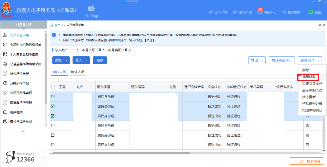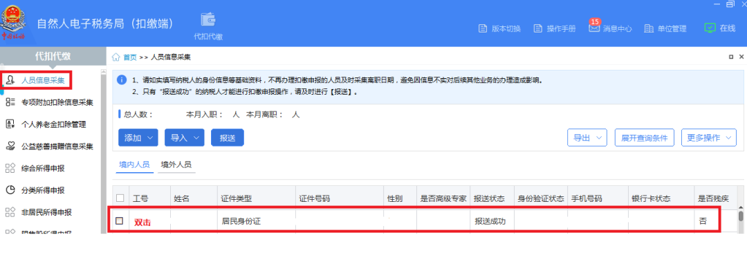 一、如有员工离职,扣缴单位应在自然人电子税务局扣缴端-【人员信息采集】功能据实填报离职日期进行报送,离职不可直接做零申报。若希望在人员信息采集页面中不再显示该人员,可以点击【人员信息采集】-【更多操作】-【隐藏离职人员】即可。