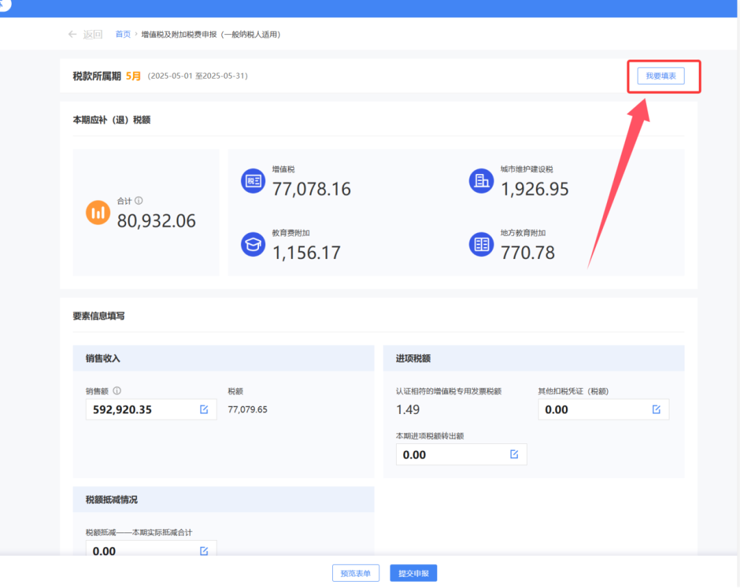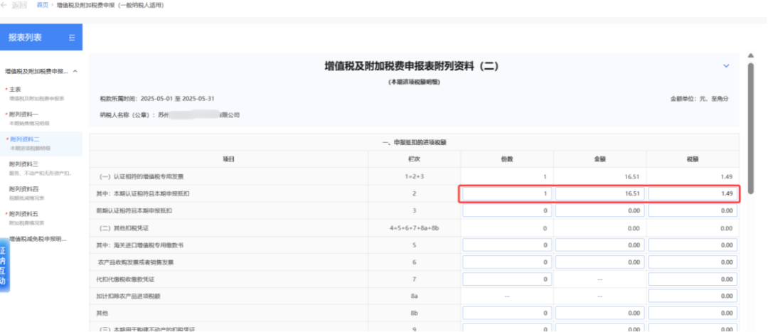 点击【我要填表】,切换到申报表界面,勾选的铁路电子客票数据自动带入《增值税及附加税费申报表附列资料(二)》(本期进项税额明细)的第2栏“认证相符的增值税专用发票”相关栏次中。