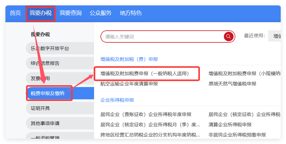 登录电子税务局,在【我要办税】-【税费申报及缴纳】-【增值税及附加税费申报(一般纳税人适用)】功能菜单中进行当期纳税申报。