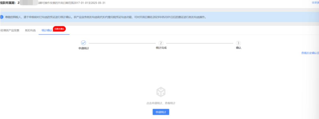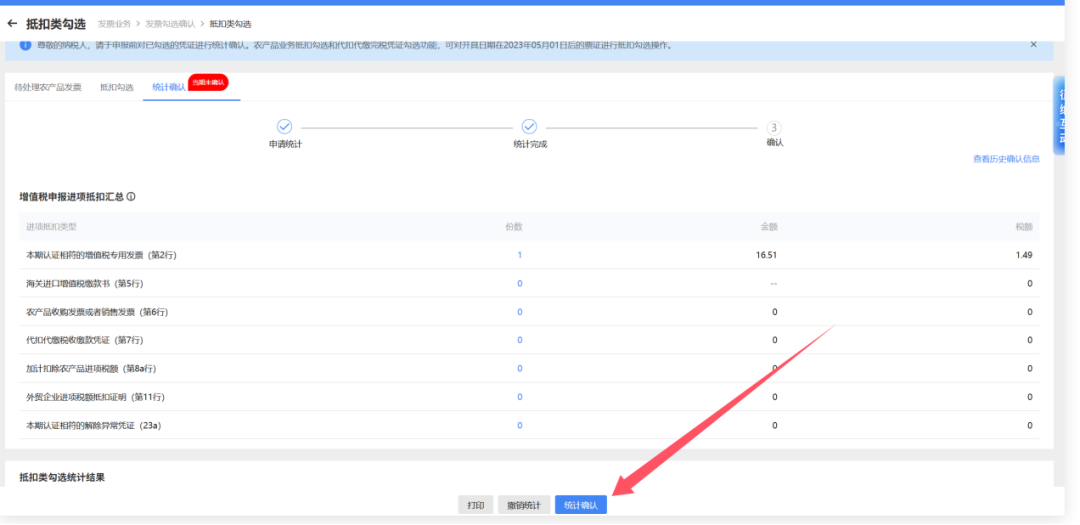 当月所属期相关发票全部抵扣勾选后,依次点击【税务数字账户】-【发票勾选确认】-【抵扣类勾选】-【统计确认】,进入发票统计确认界面,进行发票勾选汇总操作。