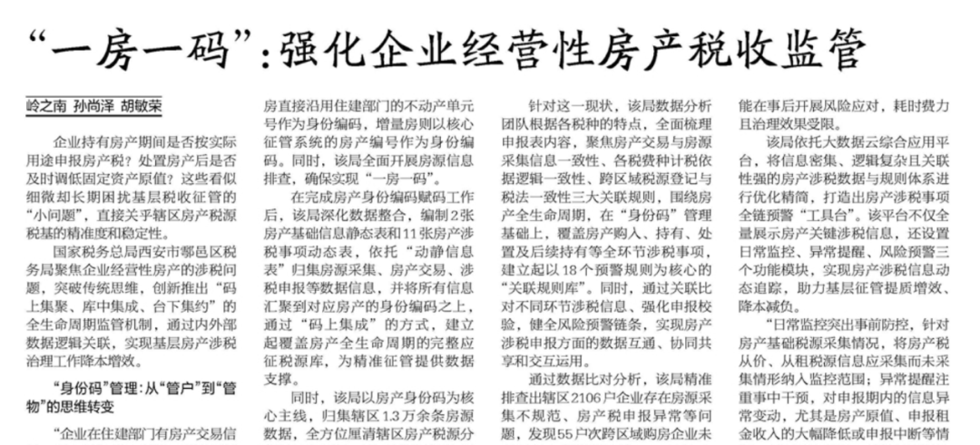 国家税务总局西安市鄠邑区税务局聚焦企业经营性房产的涉税问题,突破传统思维,创新推出“码上集聚、库中集成、台下集约”的全生命周期监管机制,通过内外部数据逻辑关联,实现基层房产涉税治理工作降本增效。