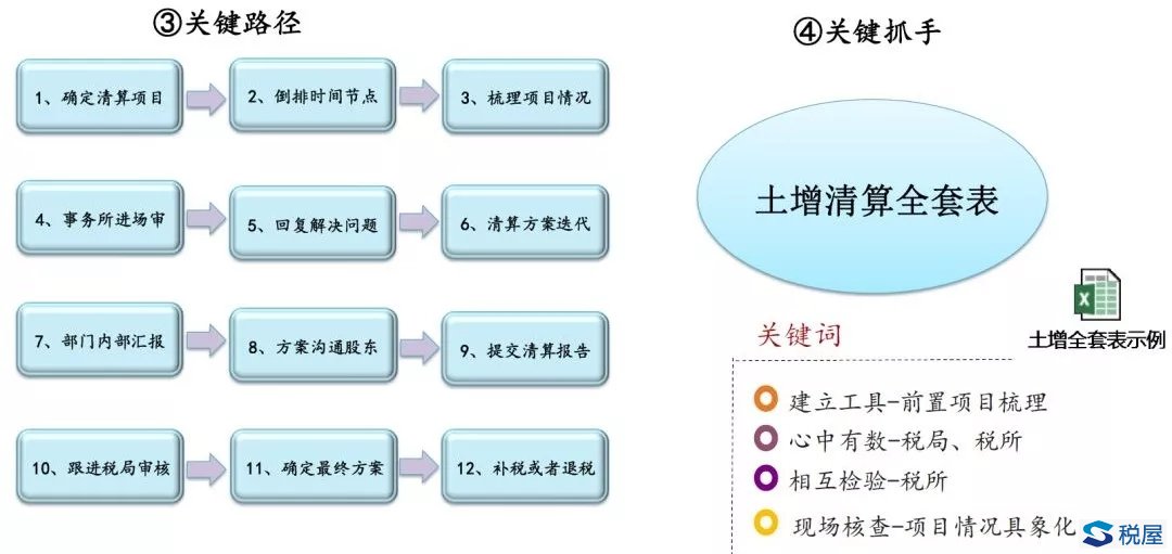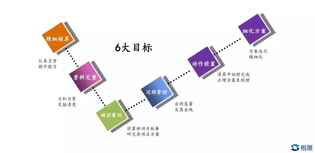 我们还能做的就是6大目标,清算时账面收入成本需要跟实际情况核对,所以精细化的核算可以节省很多核对时间,同时资料的完整性和准确及时提供也是节点的保障。同时在清算前甚至是新项目刚拿到时就要做的提前筹划和过程管控,等项目到了清算前再用上面关键抓手即土增清算全套表,那么清算结果将变得水到渠成,事半功半。