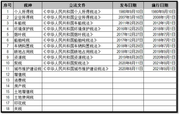 我国现行税种共有18个,截至2020820日,已立法的税种有11个,剩余7个税种尚未完成立法程序,部分还在征求意见中,一般以暂行条例等行政法规发布执行。