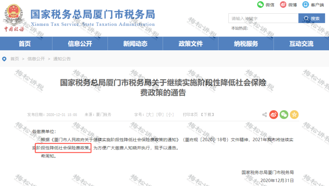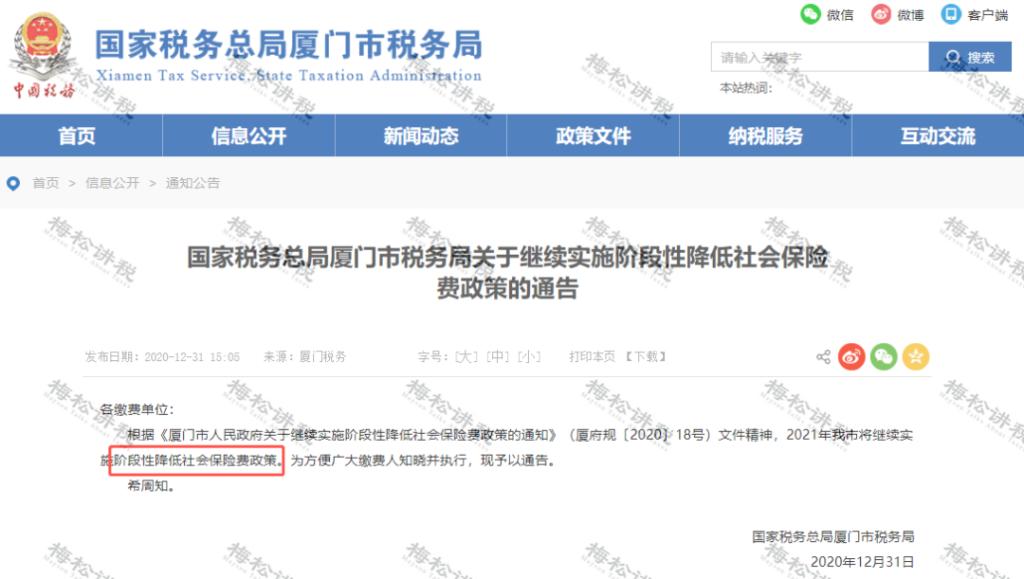 近日,厦门市税务局发布关于继续实施阶段性降低社会保险费政策的通知: