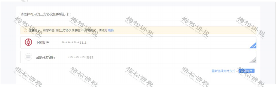 (1)支付方式选择【三方协议缴款】,点击【立即支付】;确认此次缴税所使用的三方协议缴款账户,点击【确定】发起扣款请求完成缴税。