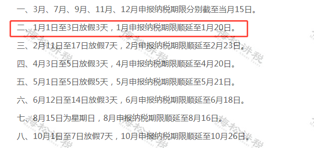 除当地主管税务局另行通知外,其他地区1月征收期均为1月20日。