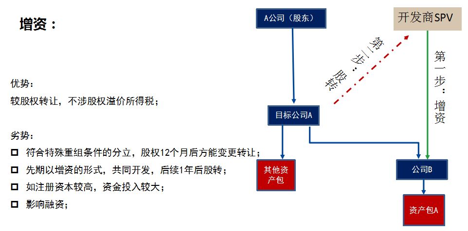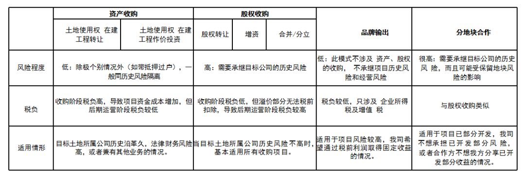 通过与合作方联合组建项目公司、股权收购、增资、合并分立等多种形式,最终获得目标公司的部分或全部股权,从而间接取得目标公司所持有的土地使用权或在建工程。