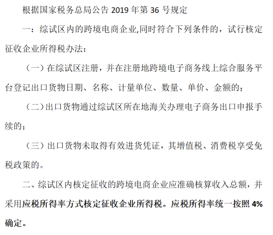 3、综试区内的企业可以办理企业所得税核定征收,根据国家目前规定按照应税所得率4%核定,并且在综试区内实行核定征收的跨境电商企业符合小型微利企业优惠政策条件的,也可享受小型微利企业所得税优惠政策。