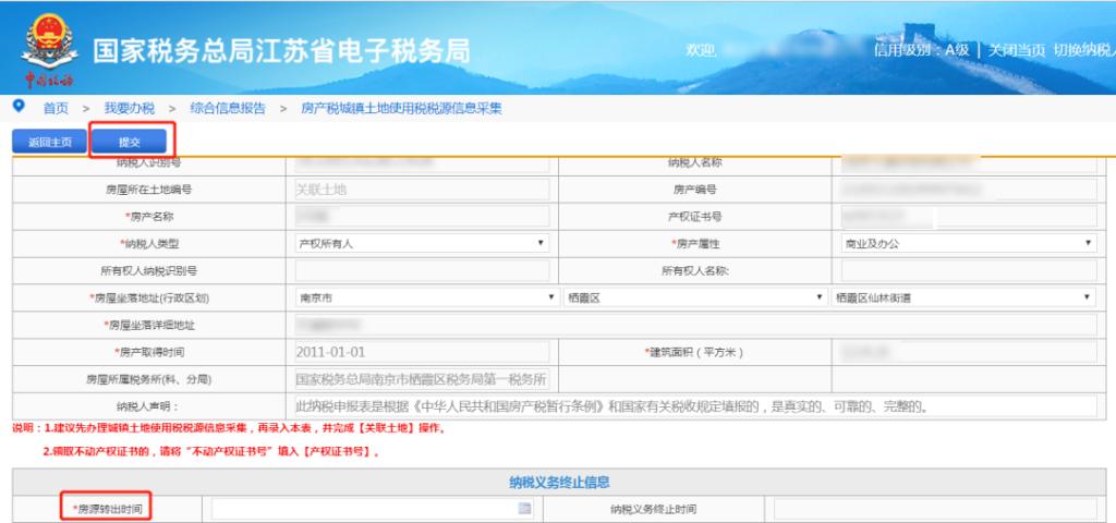 房产税纳税义务终止时,点击“义务终止”,填报房源转出时间,点击“提交”按钮。