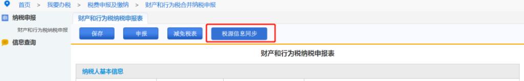 已做过税源采集且税源没有变动的,直接点击“财产和行为税合并纳税申报”按钮,进入财产和行为税纳税申报表界面,勾选需要申报且已完成税源采集的报表,点击“税源信息同步”。