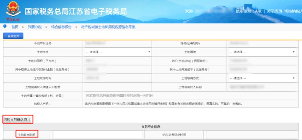 城镇土地使用税纳税义务终止时,在该税源操作选项中点击“义务终止”,填报土地转出的时间后,点击“纳税义务确认终止”按钮。