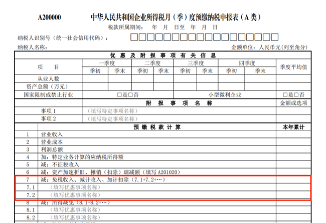 企业预缴享受研发费用加计扣除政策的,只需在《中华人民共和国企业所得税月(季)度预缴纳税申报表(A类)》(A200000)第7行“减:免税收入、减计收入、加计扣除”项下的明细行次填报有关事项及加计扣除金额即可。由于制造业企业和非制造业企业加计扣除比例不同,企业在填报时需要注意:符合条件的制造业企业,填报事项为“企业开发新技术、新产品、新工艺发生的研究开发费用加计扣除(制造业企业按100%加计扣除)”;其他行业企业,填报事项为“企业开发新技术、新产品、新工艺发生的研究开发费用加计扣除(非制造业企业按75%加计扣除)”。采用网络方式申报的纳税人,可以直接在下拉菜单中选择,无需人工填写。