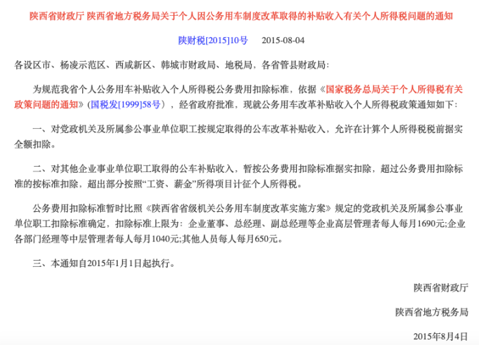 2、可扣除用车补贴1000元/月;根据陕财税(2015)10号中关于用车补贴可限额扣除的规定,李四可适用政策关于中层管理者扣除标准最高不超过1040元。月 ,即李四每月车补1000元可全额扣除,具体政策政策规定如下: