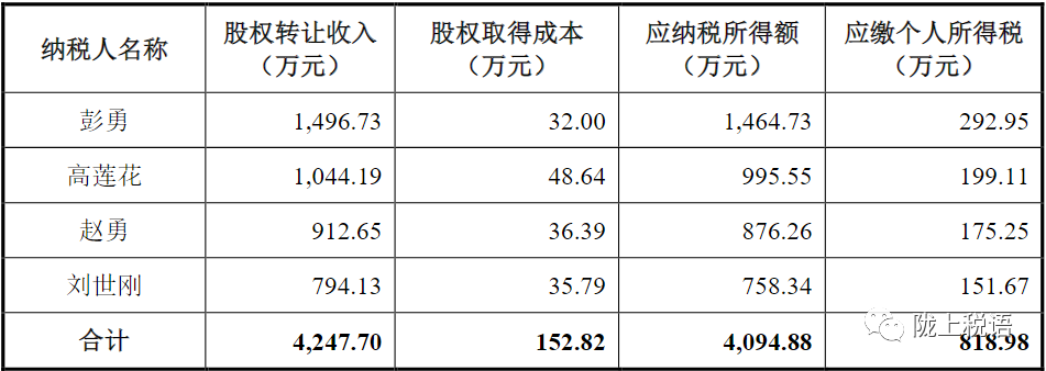 从上可见,彭勇、高莲花、赵勇、刘世刚直接转让股权应缴纳的个人所得税合计为818.98万元;通过将直接持有的股权转让给设立的个人独资企业后再转让给唐海珍、肖丽萍的方式应缴纳的个人所得税为48.86万元,差额为770.12万元。