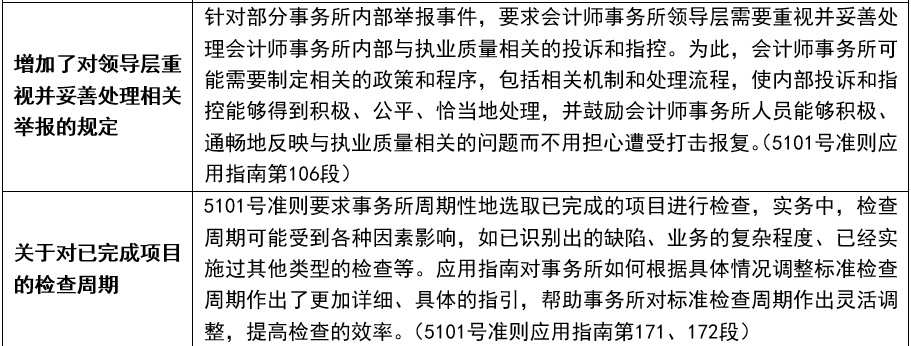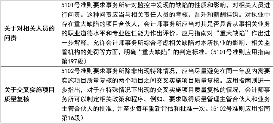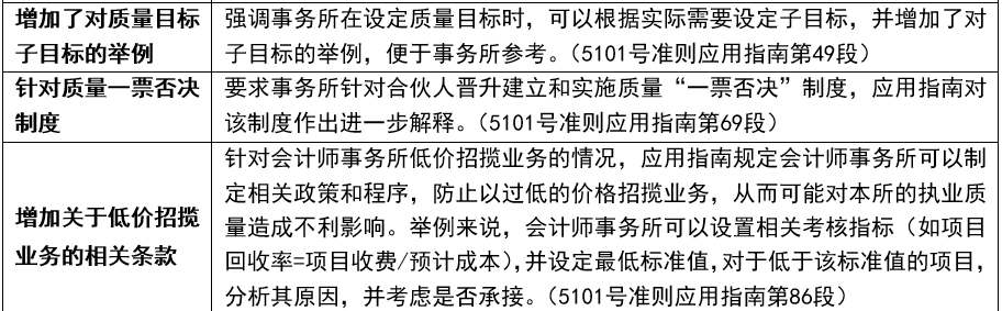 修订后的三项质量管理准则应用指南在保持与国际准则的持续全面动态趋同的总体原则下,切合我国注册会计师行业的实际情况和常见问题,兼顾了不同规模、不同组织架构会计师事务所的诉求,在准则国际趋同的要求基础上结合了中文写作体例和惯例,有助于提高准则和应用指南的可理解性和可操作性。例如,针对事务所质量管理体系中的人员分配,应用指南既解释了准则相关规定的目的和意图,又针对大小型事务所分别提供了相关示例。又如,针对质量管理准则提出的合伙人晋升实行“质量一票否决”制度提供进一步说明,并鼓励事务所建立与执业质量挂钩的合伙人奖惩机制。