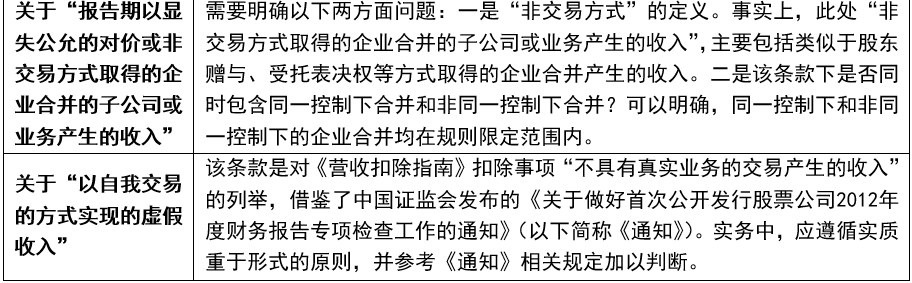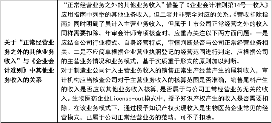 其他修订还包括:正常经营之外的其他业务收入的列举项删除“债务重组”,因为根据《债务重组准则实施问答》,以存货清偿债务方式进行的债务重组不适用收入准则,相关损益计入记入“其他收益”;类金融业务所产生的收入的列举项增加“融资租赁(为销售主营产品而开展的融资租赁业务除外)、典当”;“不具备商业实质”的判断原则“未改变企业未来现金流量的风险、时间分布或金额”改为“未显著改变企业未来现金流量的风险、时间分布或金额”;“同一控制下企业合并产生的子公司”改为“同一控制下企业合并的子公司”;“交易价格显失公允的交易”改为“交易价格显失公允的业务”。