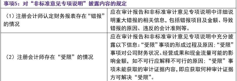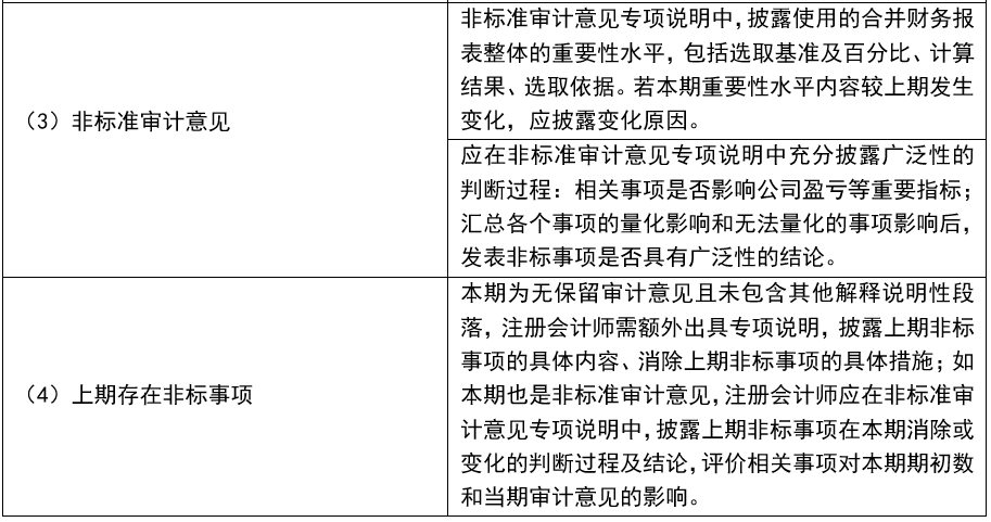• 如果整套财务报表的审计报告为非无保留意见,或者包含关键审计事项、其他信息、与持续经营相关的重大不确定性等解释性说明段落,在对特殊目的编制基础财务报表、单一财务报表、财务报表的特定要素的审计报告或者对简要财务报表出具的报告中也需要对上述内容或要素做出说明。