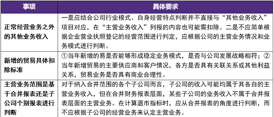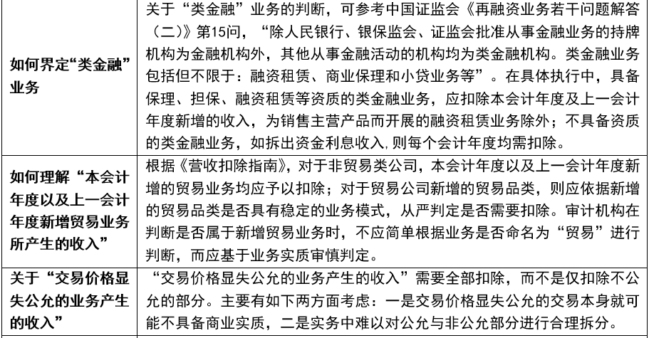 《扣除指南》细化了执行标准、明确了总体要求、修订了具体扣除项,并提出了中介机构的核查要求。《扣除指南》的主要变化包括:细化贸易、类金融业务扣除要求,明确了不具备资质的类金融业务收入、本会计年度以及上一会计年度新增的具备资质的类金融和贸易业务收入应当扣除;增加兜底项目、明确稳定业务模式的判断原则和判断稳定业务模式应关注的具体情形;新增扣除以显失公允的对价或非交易方式取得的企业合并子公司或业务产生的收入,以防个别上市公司通过受托表决权、受赠等方式,在不付出交易对价的情况下将相关企业纳入合并报表突击增大营业收入以规避退市的情形。