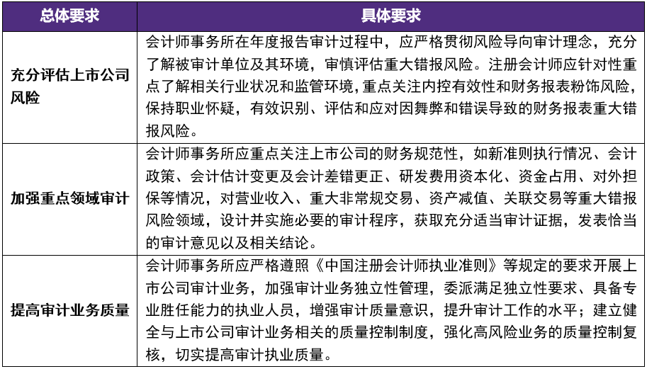 中注协通知要求各事务所要严格遵守各地区疫情防控各项要求,统筹妥善安排受疫情影响地区的年报审计工作,关注疫情对按照常规手段执行审计程序的可行性和预期效果的影响,合理审慎采用非常规审计手段。严格遵守职业道德要求、着力完善质量管理体系、重点关注风险较高的行业和业务领域、及时做好年报审计业务信息报备。通知要求注册会计师关注审计风险较高的行业与公司,包括:可能触发股票退市条件的上市公司,境外业务占比较高的上市公司,互联网行业相关上市公司,金融类相关上市公司,可能存在持续经营相关的重大不确定性的上市公司。通知还要求注册会计师关注高风险审计领域,包括:货币资金审计、收入审计、租赁相关业务审计、资产减值审计和在建工程审计等。