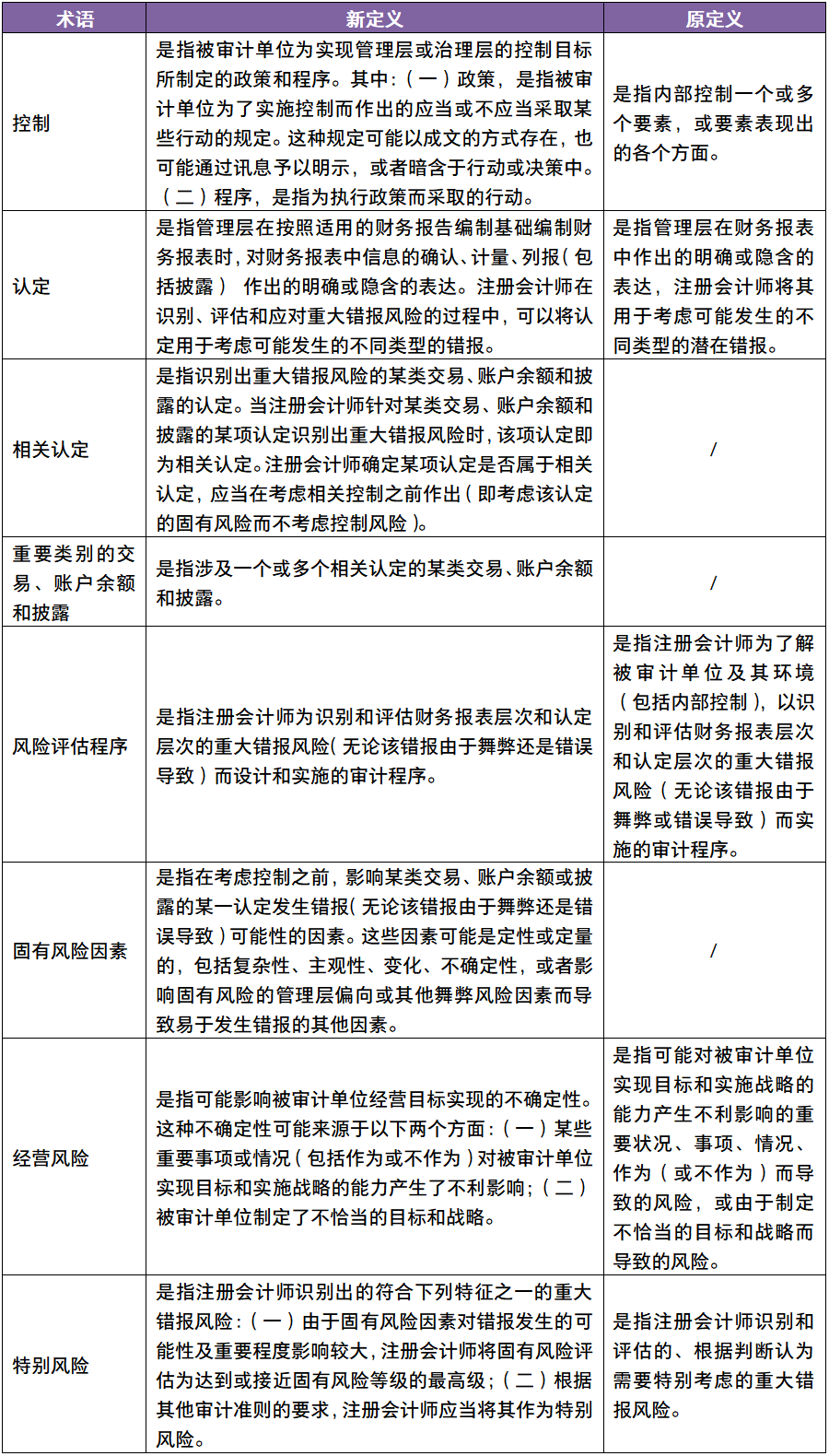 本次修订提出一些新的概念或定义,同时在风险评估程序和相关活动、了解被审计单位及其环境、适用的财务报告编制基础以及内部控制体系各要素,以及识别和评估重大错报风险和工作底稿等方面作出了规范并提供了指引。