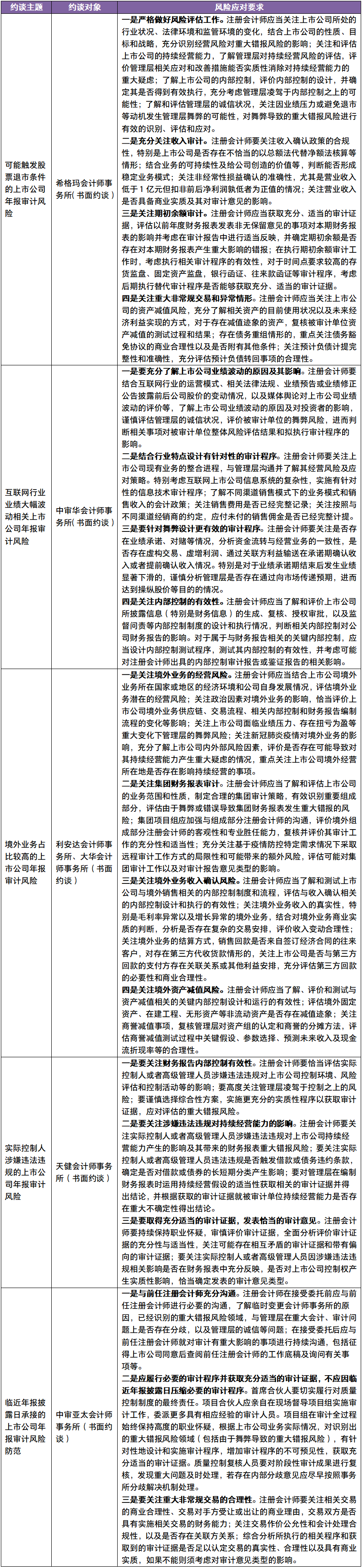 2022年1-4月,中注协分别针对可能触发股票退市条件、互联网行业业绩大幅波动、境外业务占比较高、实控人涉嫌违法违规、临近年报披露日承接上市公司业务等5类上市公司的年报审计风险,书面约谈了6家执行上市公司年度审计业务的会计师事务所。具体约谈的主题分别是:“可能触发股票退市条件的上市公司年报审计风险”、“互联网行业业绩大幅波动相关上市公司年报审计风险”、“境外业务占比较高的上市公司年报审计风险”、“实际控制人涉嫌违法违规的上市公司年报审计风险”、“临近年报披露日承接的上市公司年报审计风险防范”。约谈主要内容如下: