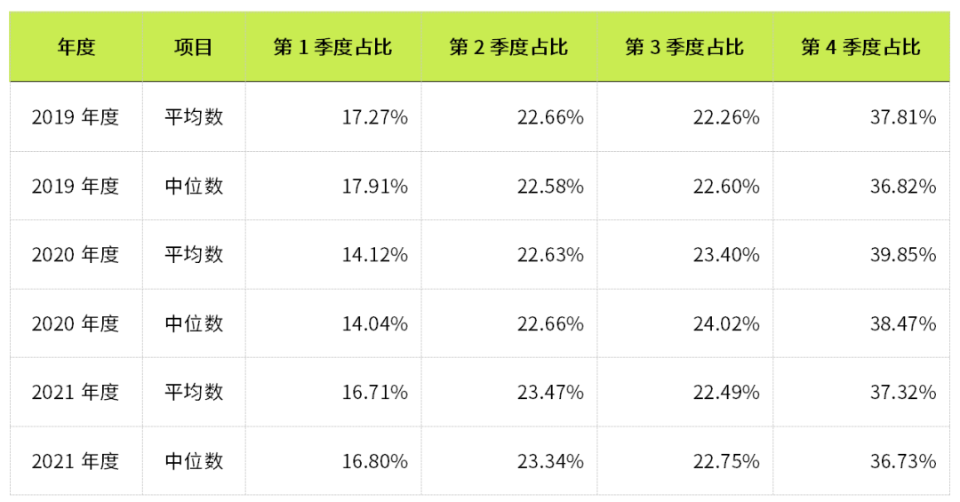 截至2021年12月31日,国内上市公司行业分类为“软件和信息技术服务业”的总数量为336家,剔除公告业绩不满3年的公司79家、ST公司11家后得到的样本总数为246家,2019年至2021年各季度收入占比见下表。