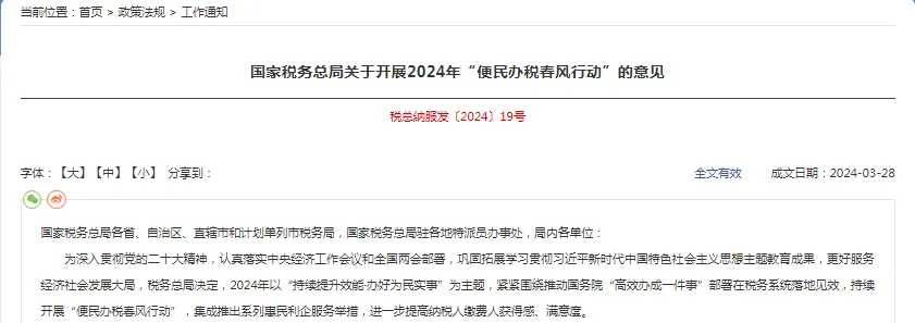4月2日,国家税务总局发布《国家税务总局关于开展2024年“便民办税春风行动”的意见》。