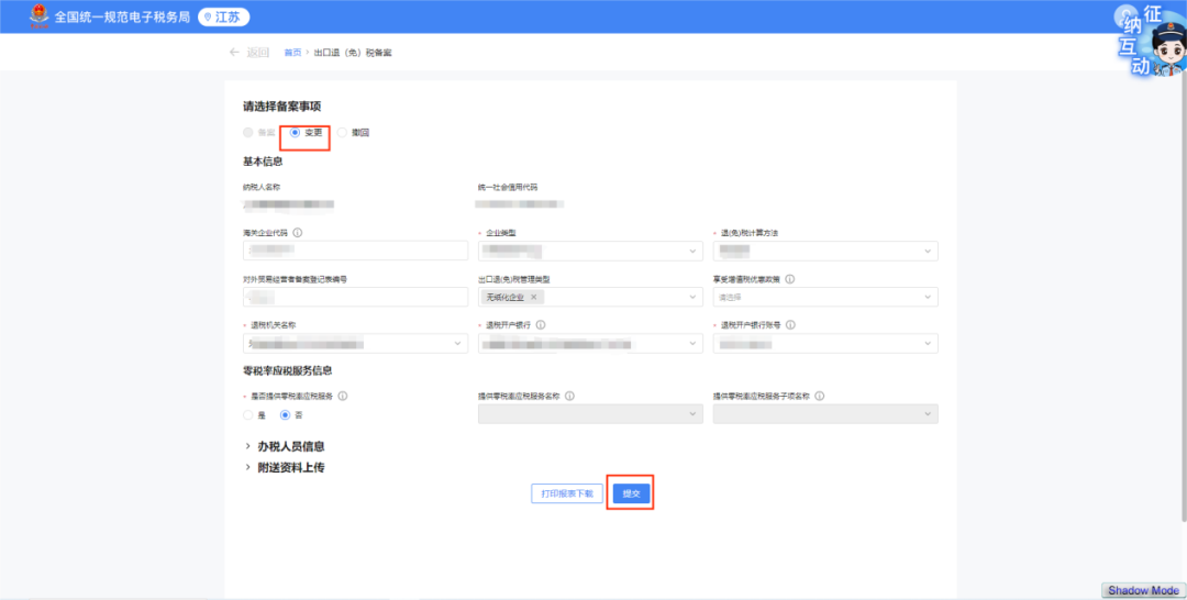 点击【我要办税】-【出口退税管理】-【出口退(免)税企业资格信息报告】-【出口退(免)税备案】功能菜单,选择“变更”,修改需要变更的备案信息后,点击“提交”,显示申请成功界面即可。